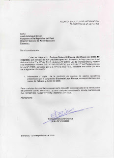 ResponderBorrar[...Hoy se vencía el plazo de 7 días que tenía una congresista “adoptada” por este blog para enviarme copia de la rendición de cuentas de sus gastos operativos, o quizás una muy cortés carta de que no podría hacerlo. Lamento decirles a los que frecuentan mi blog que fui decepcionado.